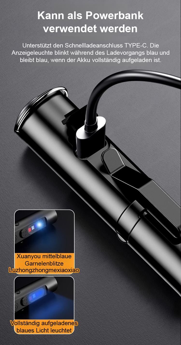 Fingergroßes Gerät leuchtet, zündet und zerschlägt Glas! 30 Tage Batterielebensdauer pro Ladung!