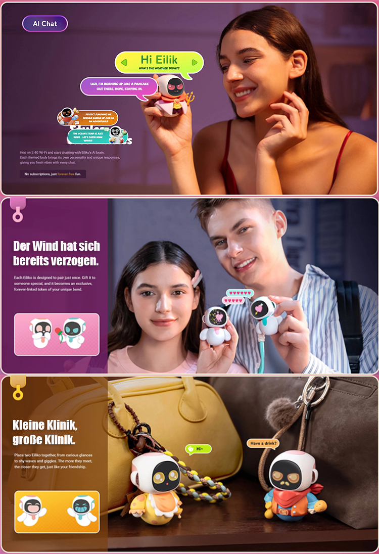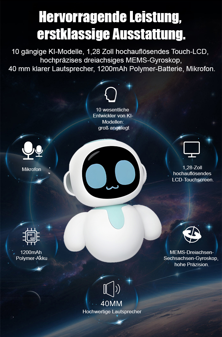 💬Echtzeit-Sprachchat: Unterhalte dich so natürlich wie mit einem echten Freund. ✋Touch- & Bewegungssensoren: Streichle ihn oder bewege ihn – er reagiert auf jede Geste. 👀Infrarot-Interaktion: Er „sieht“ andere Roboter und spielt mit ihnen. 🎭Wechselbare Hüllen = wechselnde Persönlichkeiten: Neues Aussehen, neues Verhalten! 🔑Ultra-portabel als Schlüsselanhänger: Nur 70 g leicht mit lebendigem 1,2-Zoll-OLED-Gesicht. 🎁Das perfekte Geschenk: Zum Sammeln oder Verschenken – immer ein Hingucker!